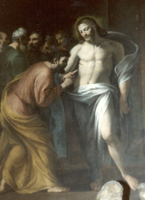 One of the eleven apostles, Thomas, missed this meeting. He had not yet seen the risen Jesus and still did not believe. "Not until I see the nail marks in his hands, and put my hand into his side, will I believe such a thing", said Thomas. A week later, Jesus appeared again. This time Thomas was there. "Here Thomas, bring you finger and touch my hands", said Jesus. Put your hand into my side. Doubt no longer, but believe." "My Lord and my God," answered Thomas (Jn 20:24-29).