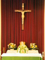 The Priest Approaches and Kisses the Altar: The altar is a symbol of Christ. In it are cut five crosses to recall the five wounds of Christ. The altar also represents the Church and has embedded in it the relics of her saints. The priest comes to the altar to celebrate the Sacrifice in the Church's name. Because of the glory surrounding the altar upon which the divine Sacrifice will be made, the kiss of the priest unites the Church to Christ, its Redeemer.